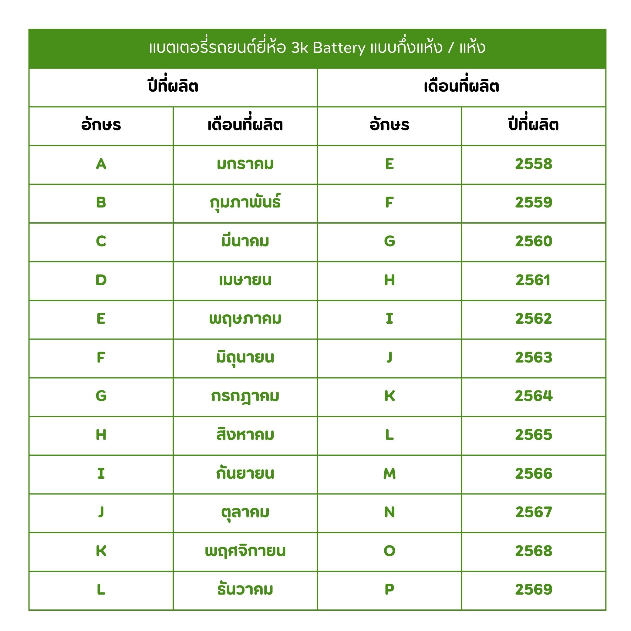 วันนี้ Bigbatt จะมาแฉ... เอ้ย! มาแชร์ "วิธีอ่านรหัสวันผลิตของแบตเตอรี่ 3K" ให้หมดเปลือก ซึ่งความลับมันอยู่ที่ "ตัวอักษรภาษาอังกฤษ" ที่ตอกอยู่บนตัวแบตเตอรี่นั่นเองครับ แต่เดี๋ยวก่อน! แบตเตอรี่ 3K เขามีสูตรลับ 2 แบบ แยกตามประเภทแบต คือ แบบน้ำ และ แบบกึ่งแห้ง/แห้ง ต้องดูให้ถูกตารางนะครับ ไม่งั้นตีความผิด ชีวิตเปลี่ยน